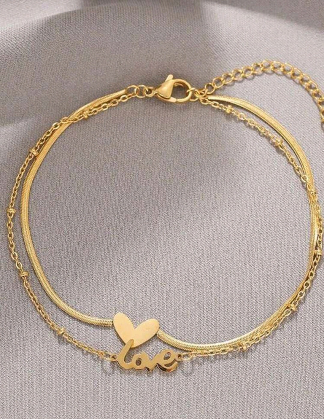 This gold-colored chain (23 cm) consists of two delicate chains that create a duet of elegance and romantic charm. On one of them, a golden heart gently shines, reminding you of love for yourself and life, and on the other, the inscription "LOVE" dances, giving warmth and confidence to every step.