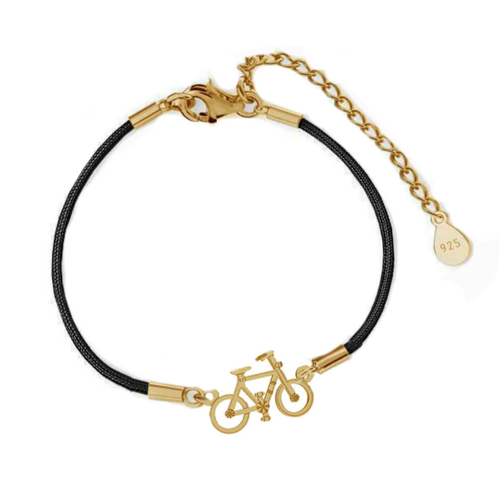 Minimalistinė virvelės apyrankė su sidabriniu dviračiu.
