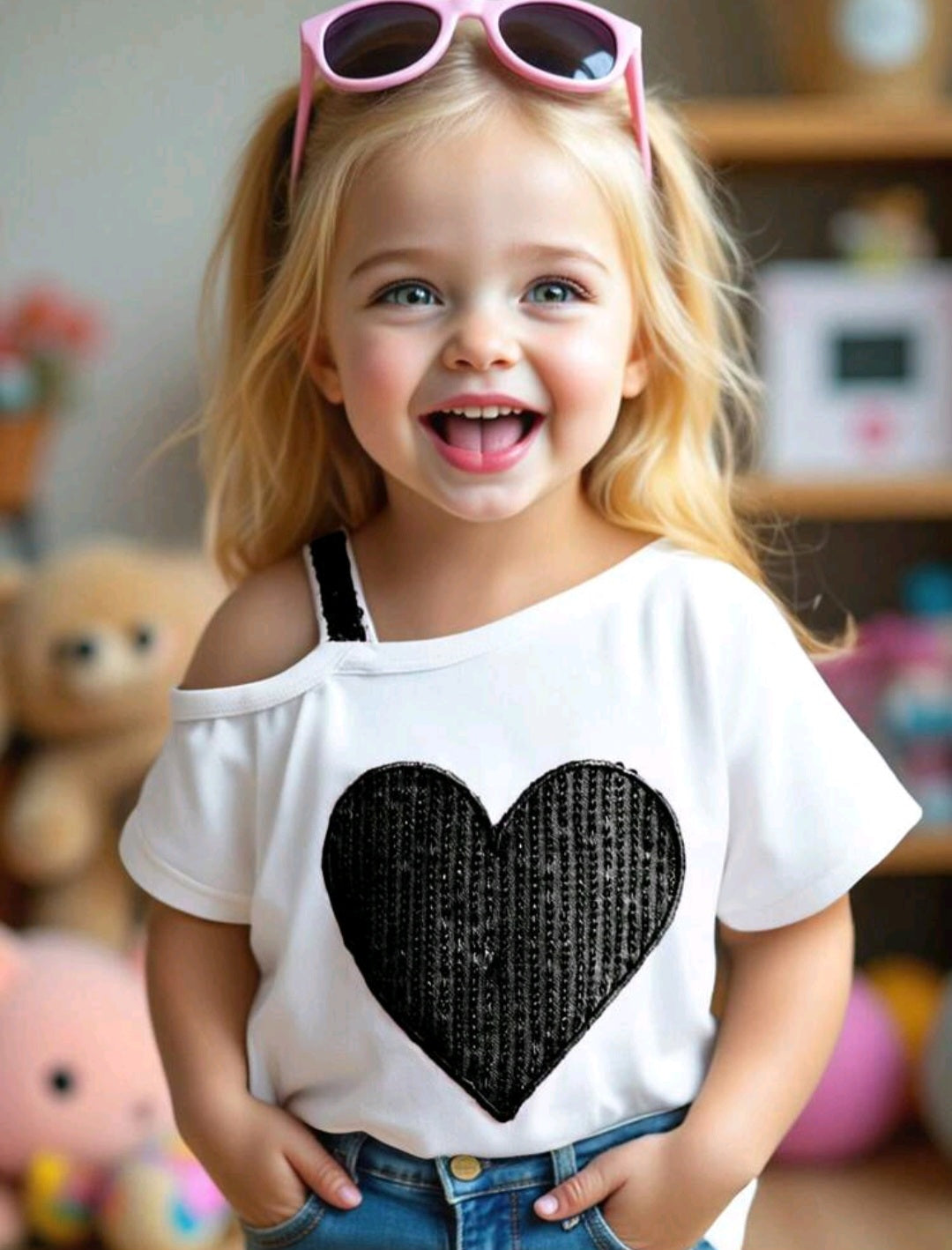 This white T-shirt for girls with hearts in different colors - black, red, light pink and dark pink - will become a favorite wardrobe detail for every little style lover .