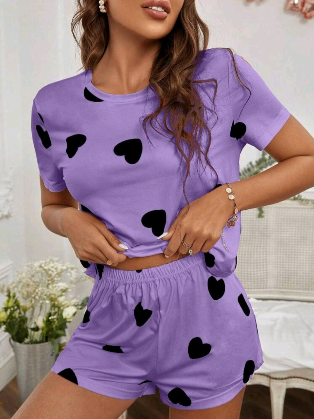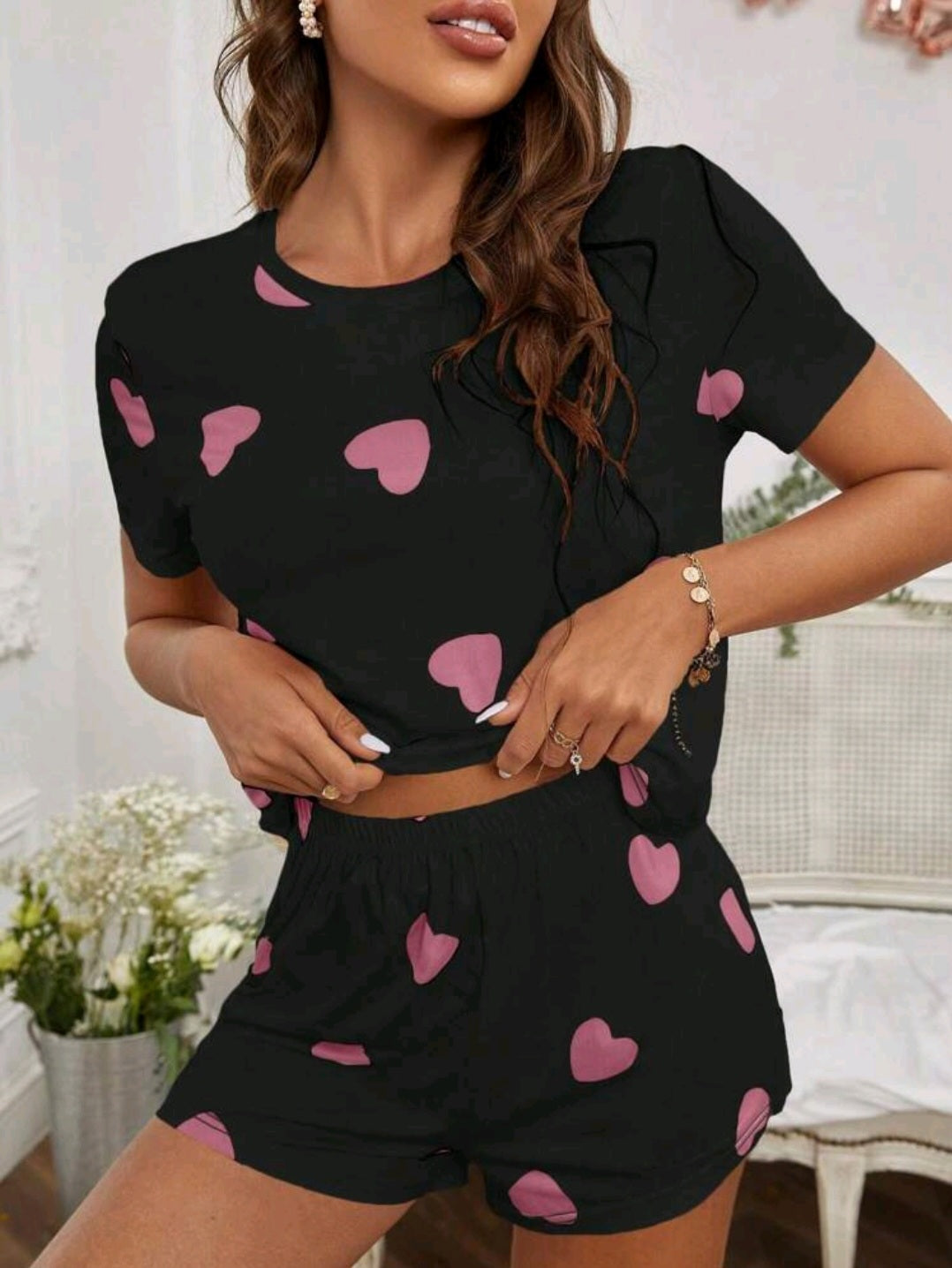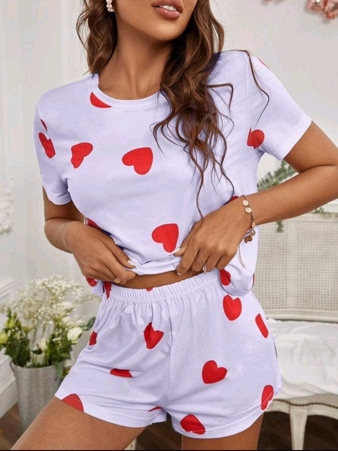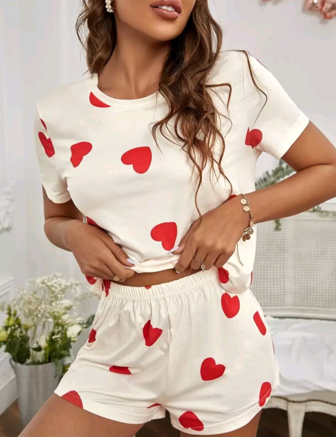 Slipping into these pajamas is like hugging a soft cloud that brings the sweetest dreams... Women's pajamas with short sleeves and shorts with cute hearts will become the joy of your evening and morning.