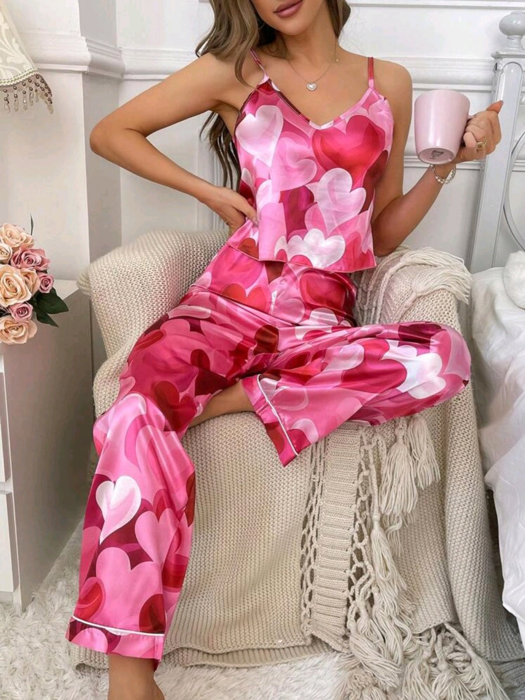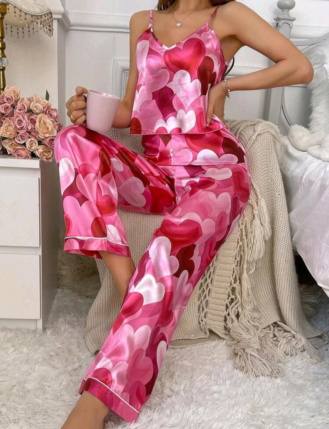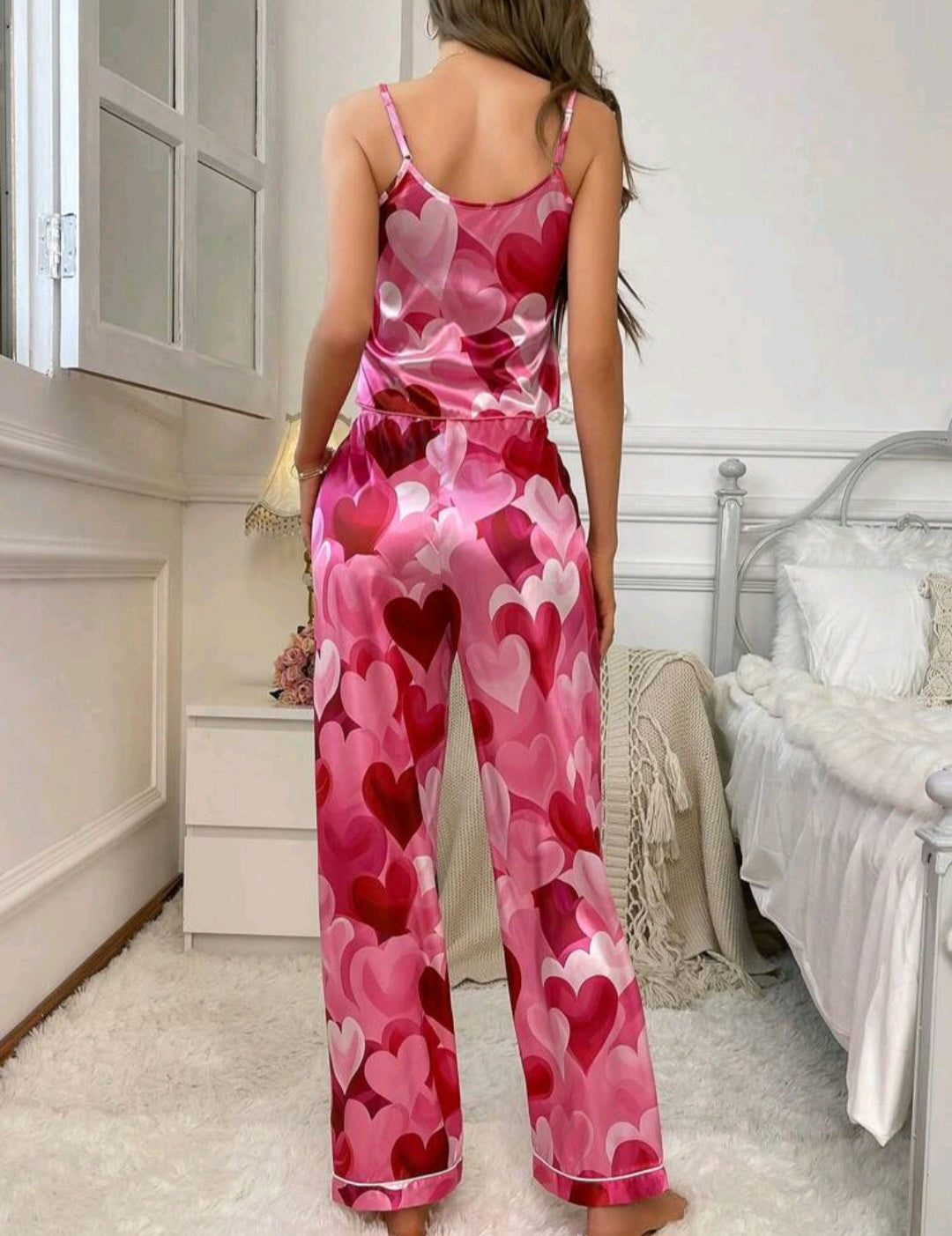 This satin pajama set with a sleeveless camisole and pants exudes lightness and elegance. Decorated with white, red and pink hearts , it reminds you of the small joys of love in everyday life.