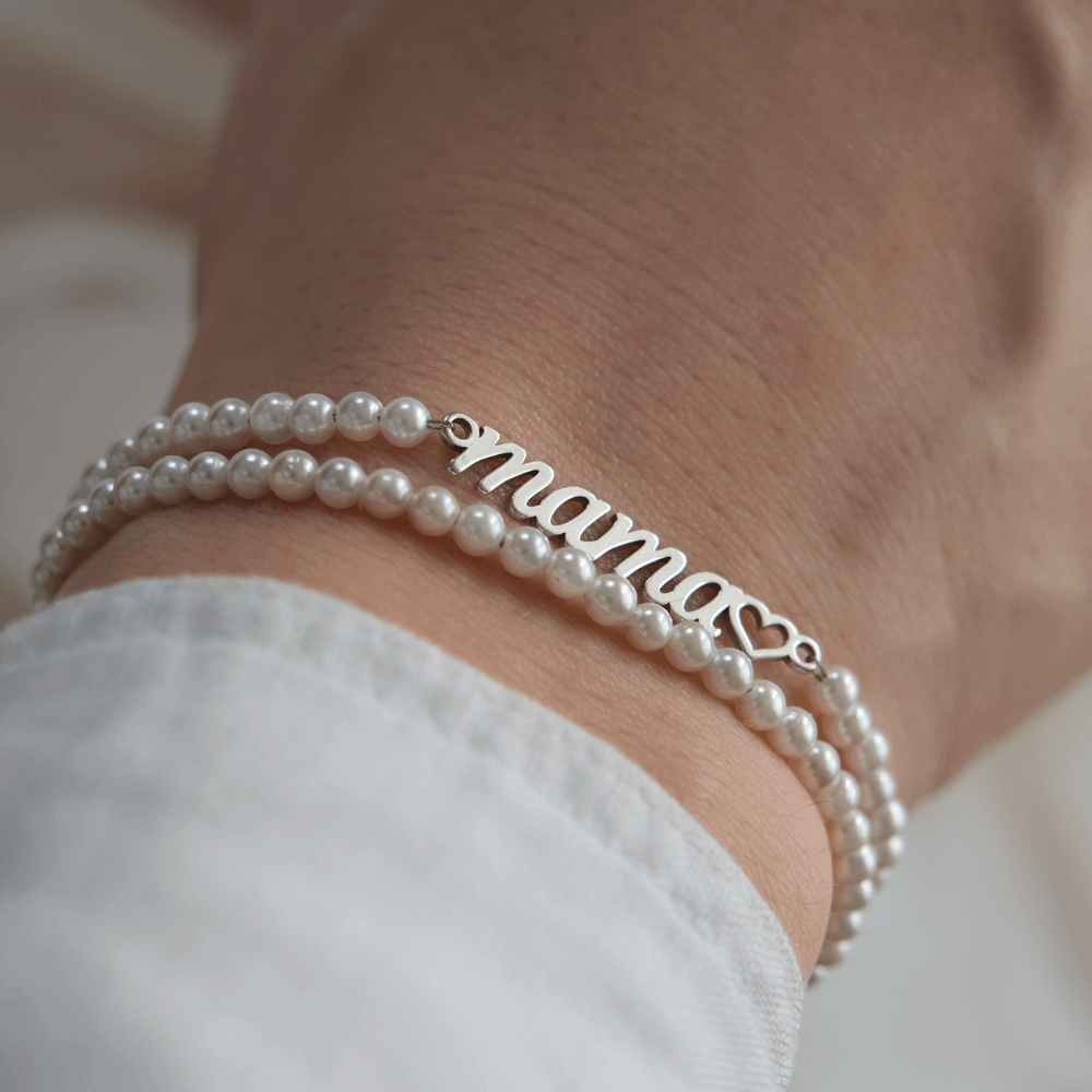 Elegantiška, smulkių kriauklės perlų apyrankė su užrašu MAMA.