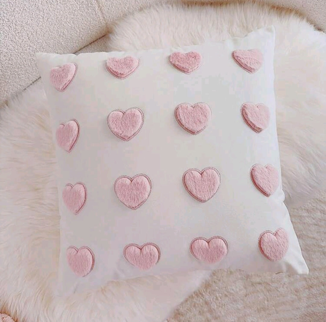 White cushion cover with plush pink hearts - tenderness and romance