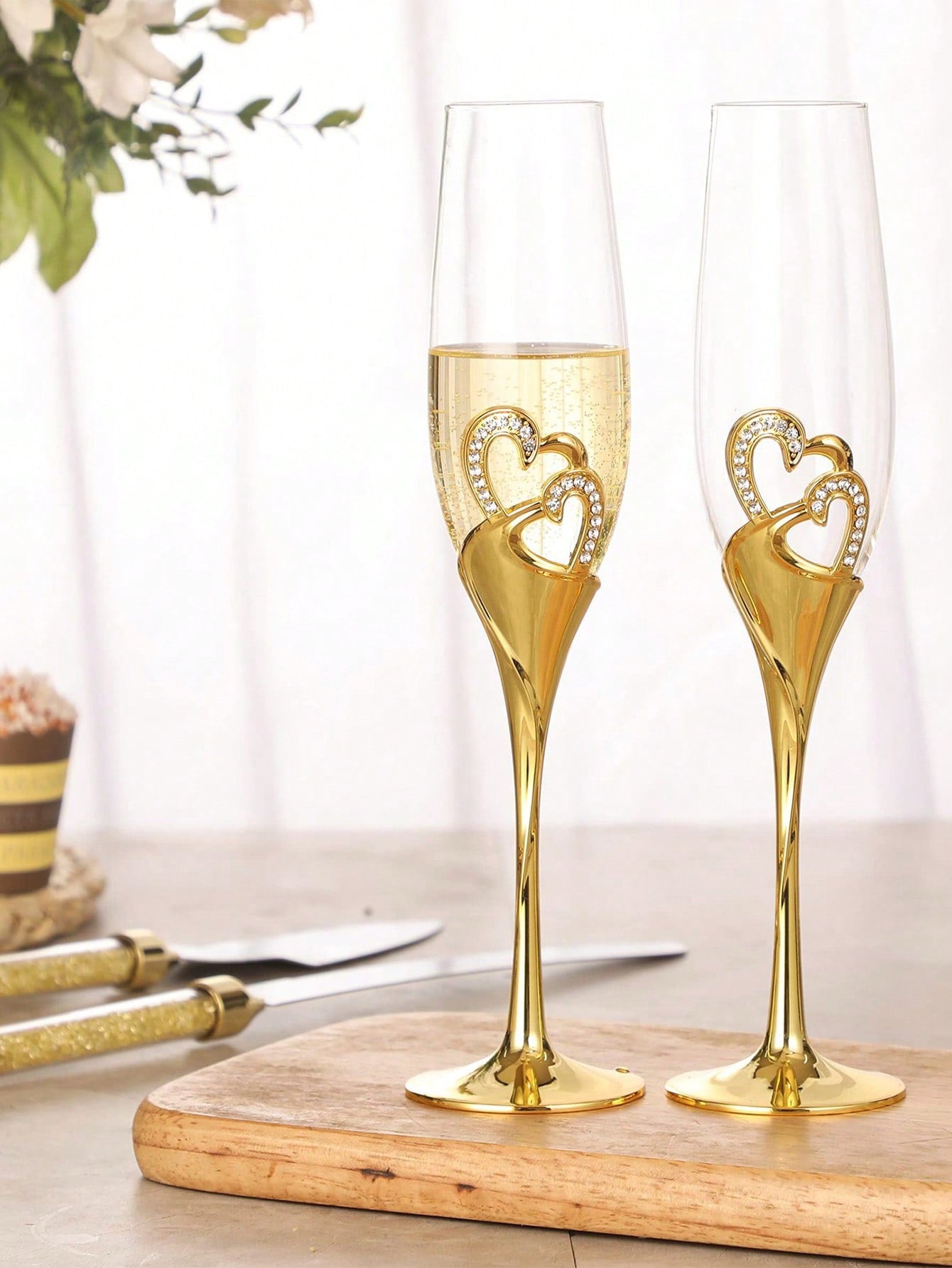 Make your special occasion even more memorable with these luxurious champagne glasses. The gold-tone stems and two intertwined hearts, decorated with sparkling crystals, symbolize love, unity and an eternal bond. These are not just glasses - they are a unique celebration detail that will become a wonderful memory.