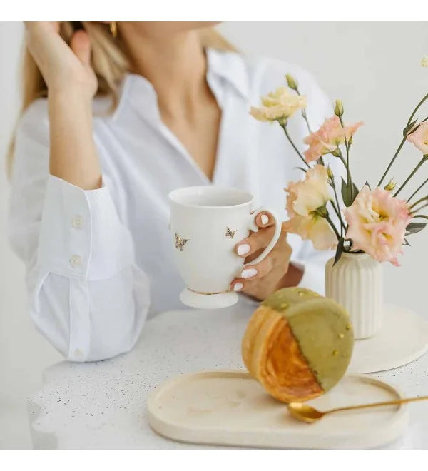 Elegantiškas, rankų darbo puodelis iš aukščiausios kokybės porceliano. Dekoruotas tikru auksu, suteikiančiu puodeliui prabangos ir išskirtinumo. Subtilūs drugelių motyvai sueikia išskirtinumo. Puikus pasirinkimas sau arba išskirtinei dovanai.