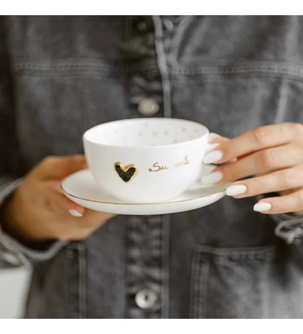 Porcelianinis puodelis su lėkštute. Balto porceliano puodelis išsiskiria subtiliu dizainu: viduje – diskretiški juodi taškeliai, o išorėje – rankomis lipdyta juoda širdelė su užrašu „Su meile”. Šis derinys suteikia puodeliui tiek žaismingumo, tiek elegancijos. Puodelis puikiai tiks tiek mėgaujantis rytinė kava, tiek vakarine arbata. Lėkštutė papuošta auksiniu krašteliu, kuri harmoningai dera su puodelio dekoru. Puikus pasirinkimas ieškantiems išskirtinio ir stilingo puodelio.