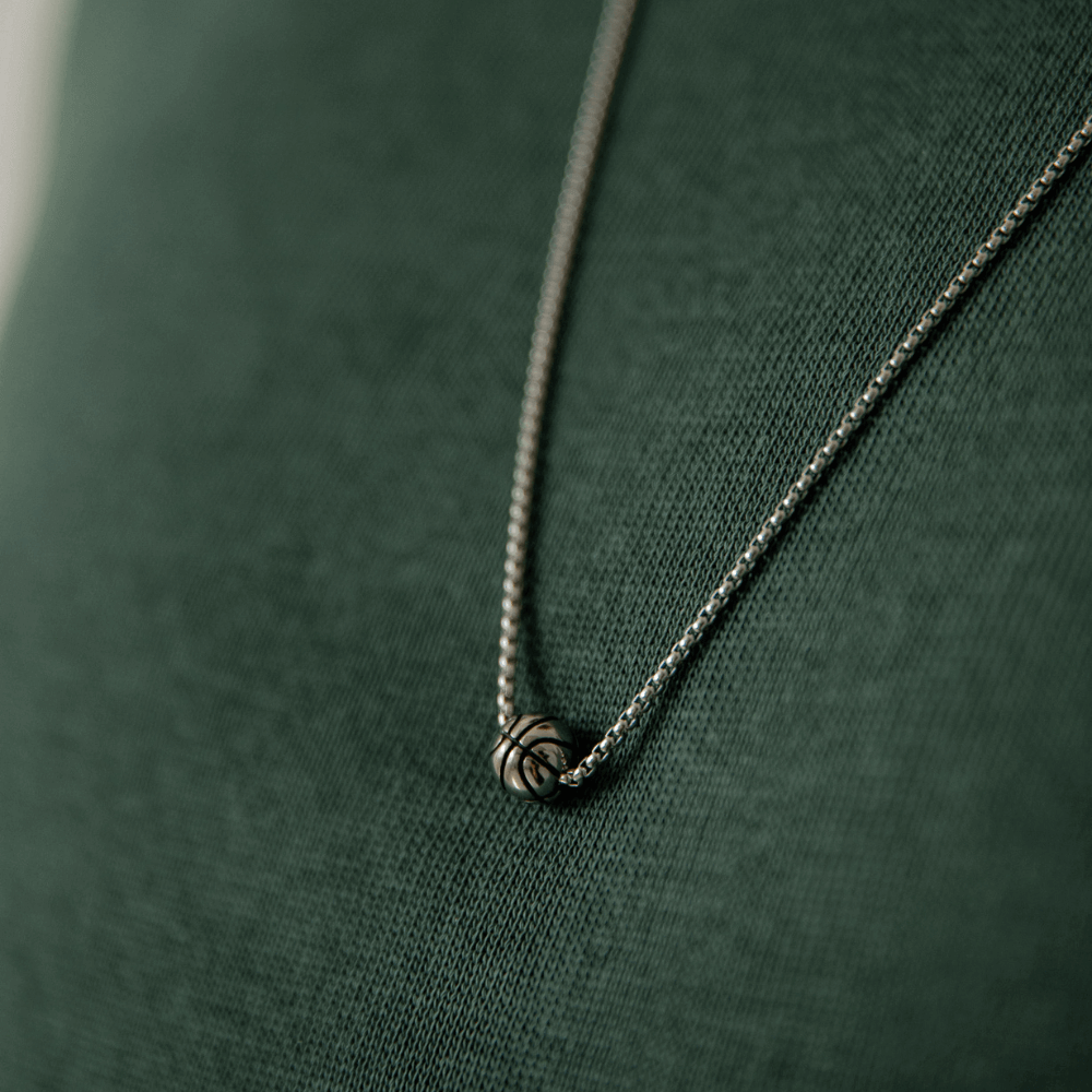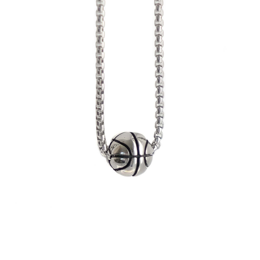 Minimalistinis vyriškas kaklo papuošalas – krepšinio kamuolys ant ilgos grandinėlės.
