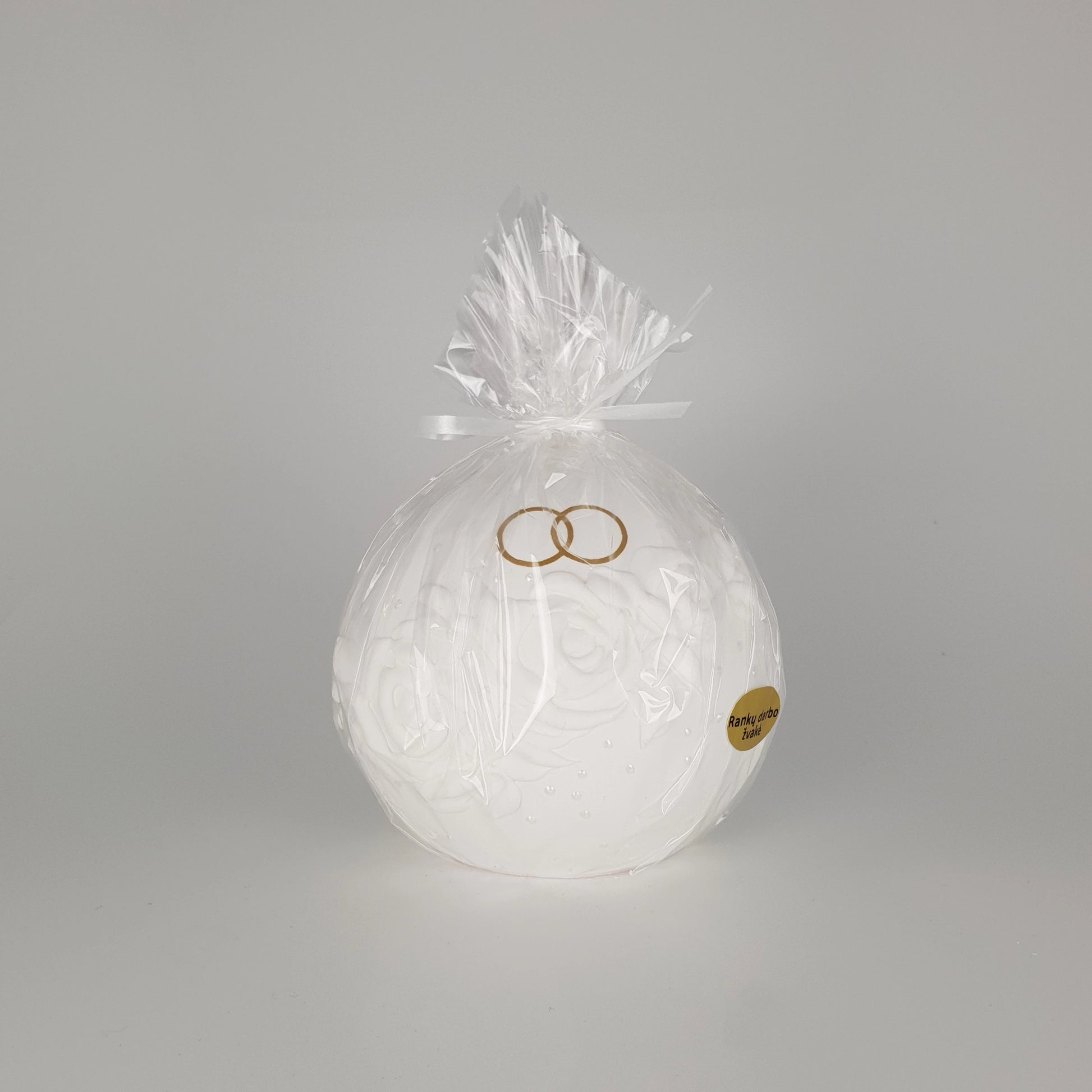 Rankų darbo sojų vaško žvakė 6cm skersmens. Apvali su vestuviniais žiedais. Tobulas pasirinkimas mūsų rankų darbo porcelianiniams šeimos židiniams.