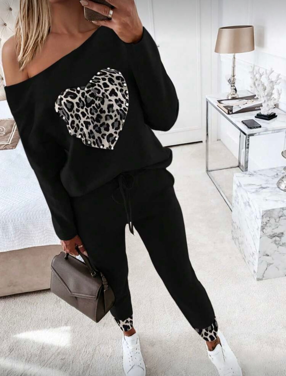 Dviejų dalių laisvalaikio kostiumas su leopardiniu širdies akcentu – juodas