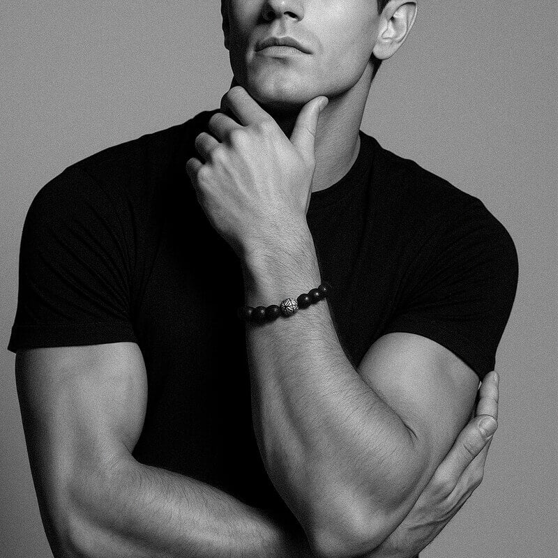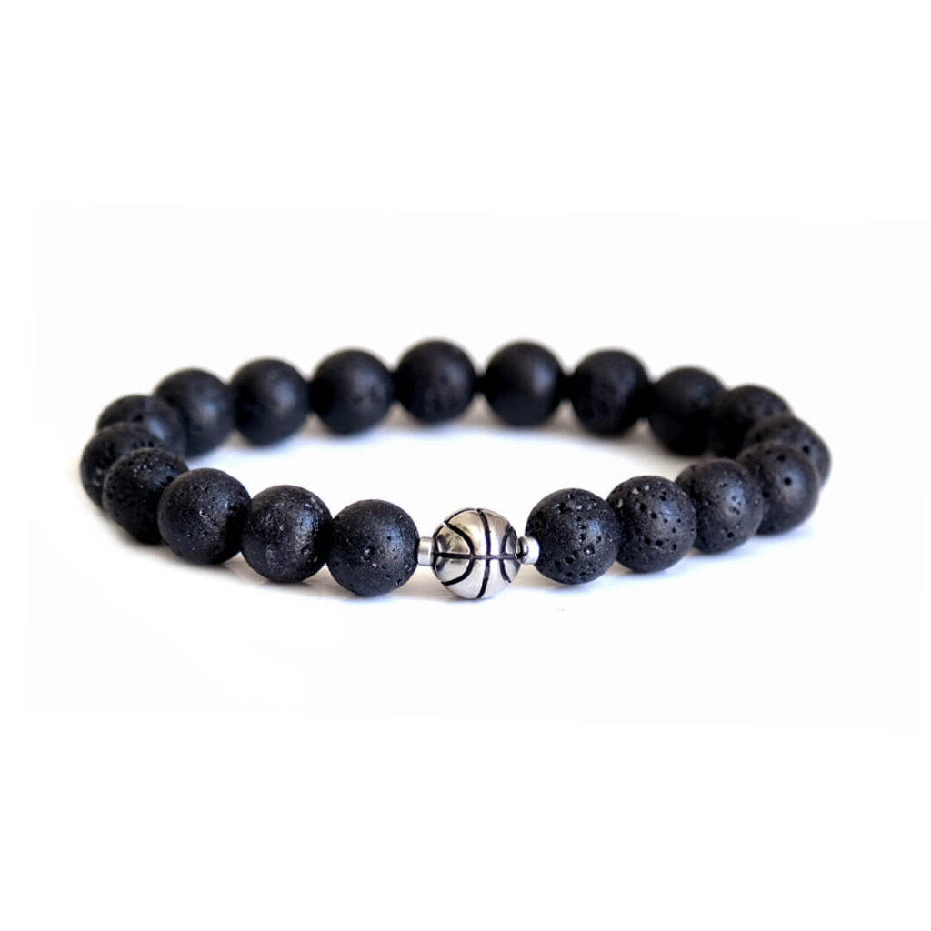 Apyrankė pagaminta iš vulkaninės lavos karoliukų su plieniniu krepšinio kamuolio intarpo.
