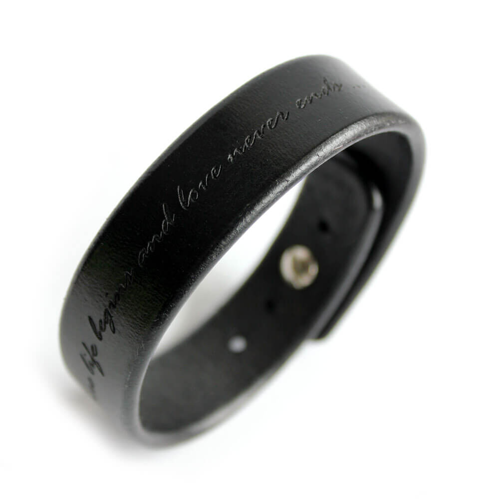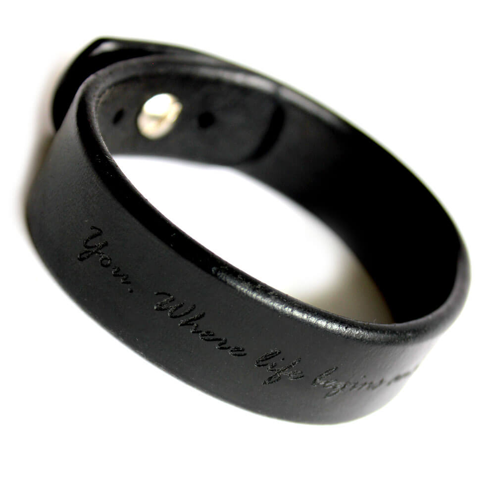 Itin kokybiškos juodos odos vyriška apyrankė su išgraviruotu užrašu: