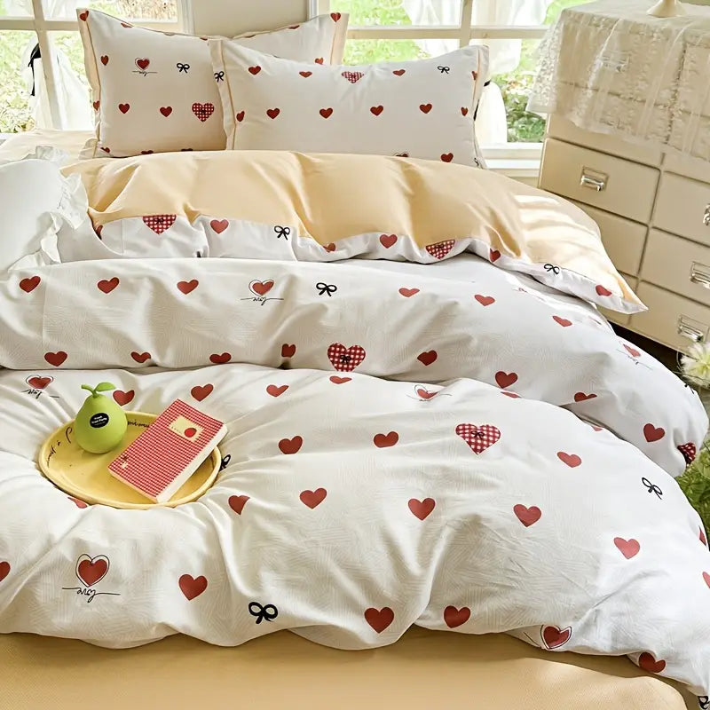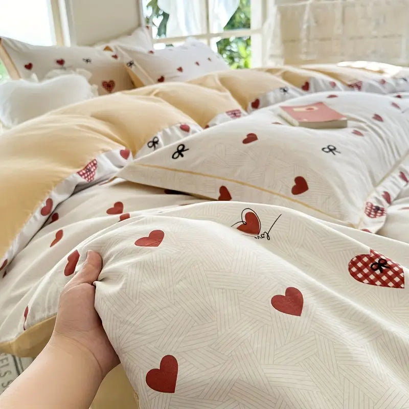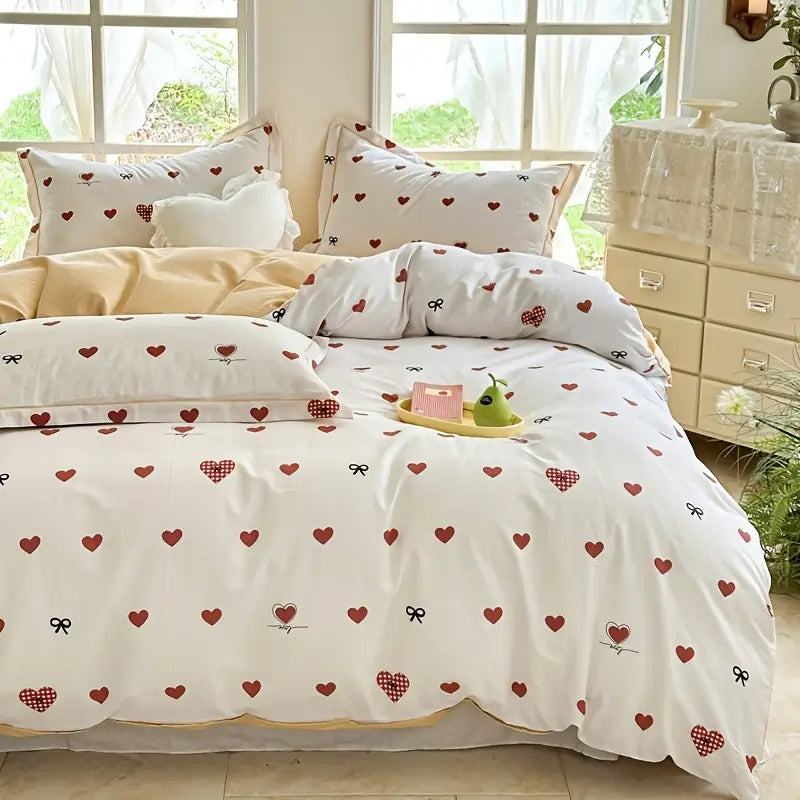 Šis mielas širdelių rašto patalynės komplektas iš minkštos medvilnės suteiks šilumos ir jaukumo kiekvienam miegamajam. Dėl patogaus užsegimo ir lengvos priežiūros tai – puikus pasirinkimas kasdienai ar dovanai.