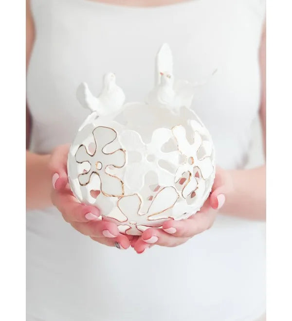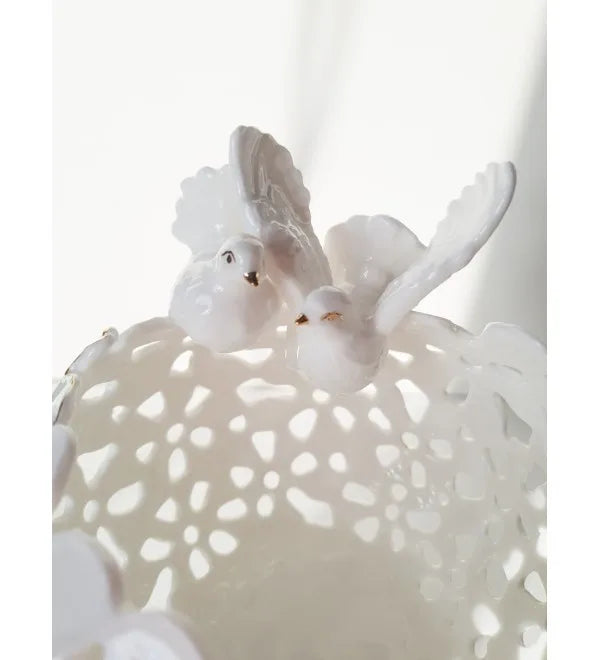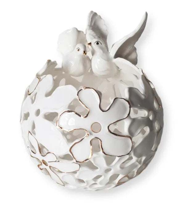 Balandžiai simbolizuoja dviejų žmonių jungtį, ilgą gyvenimą ir laimingą santuoką. Išskirtinio dizaino, ažūrinis šeimos židinys suteiks jaukumo kiekvieno namuose. Per ažūrinius išpjaustymus žvakės šviesa itin gražiai atsispindi tamsoje, sukurduma romantišką aplinką. Šeimos židinys yra rankų darbo, tad realybėje gali šiek tiek skirtis nuo pavaizduoto nuotraukoje.