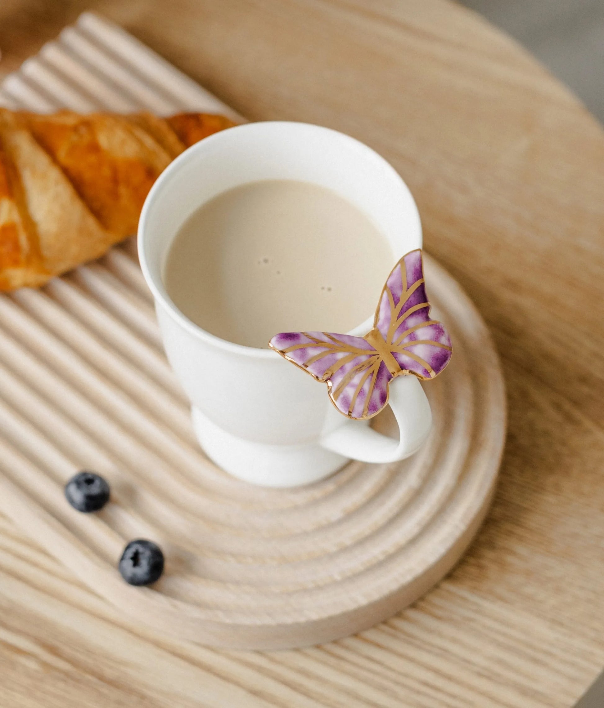 Rankų darbo išskirtinis puodelis su violetiniu drugeliu. Drugeliai dekoruoti tikru auksu! Išskirtiniai, žaismingi puodeliai tinka tiek kavai, tiek arbatai. Rytinė kava ar arbata iš šio puodelio bus puiki dienos pradžia!