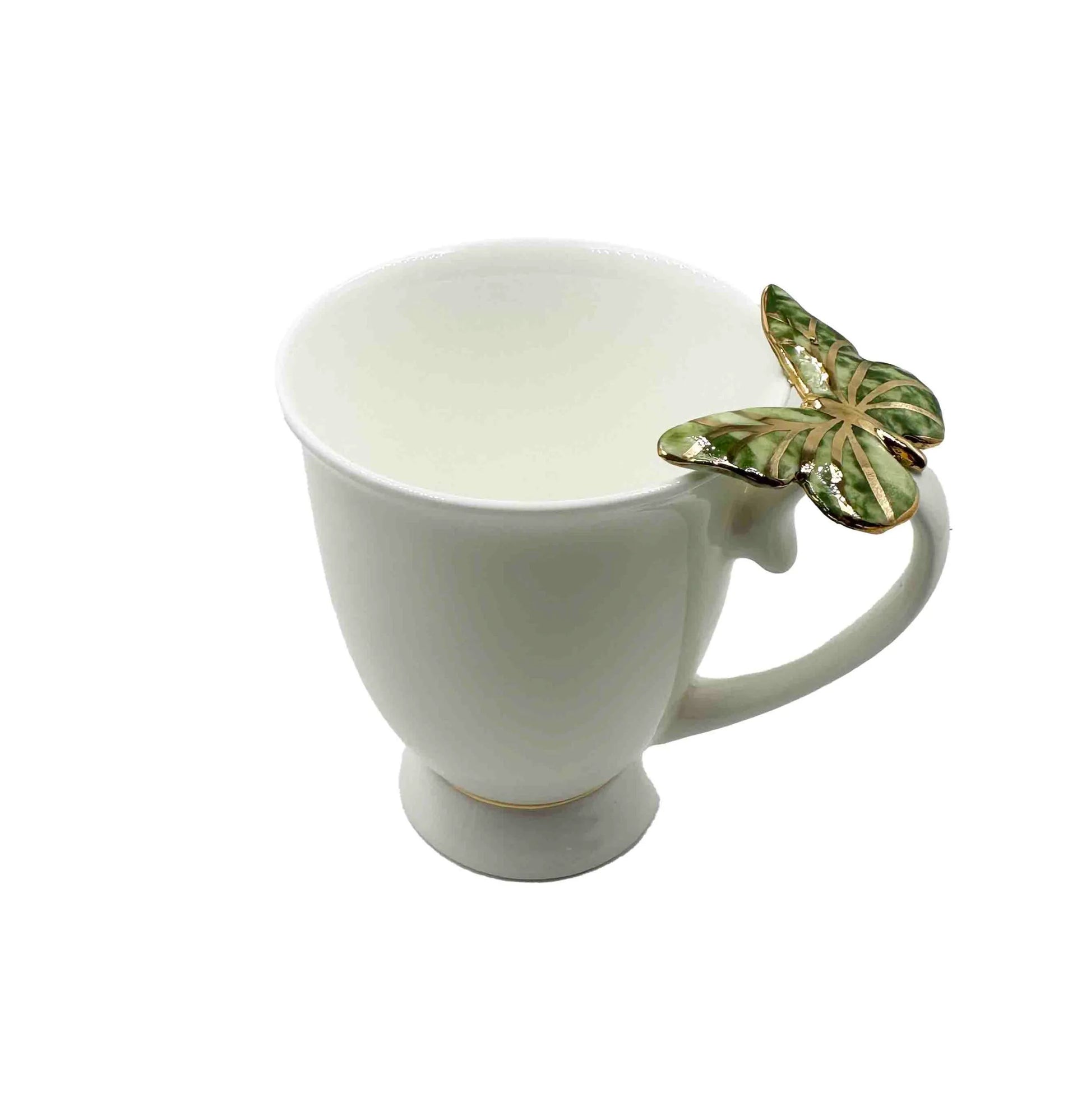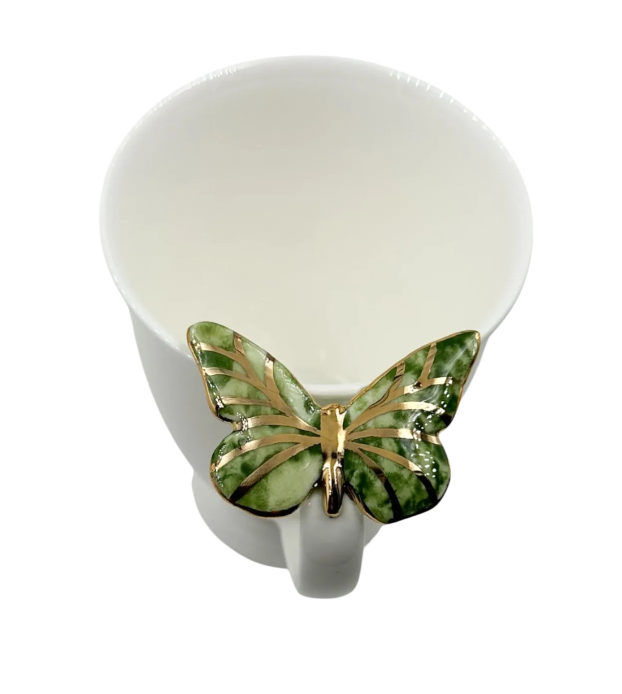 Rankų darbo išskirtinis puodelis su žaliu drugeliu. Drugeliai dekoruoti tikru auksu! Išskirtiniai, žaismingi puodeliai tinka tiek kavai, tiek arbatai. Rytinė kava ar arbata iš šio puodelio bus puiki dienos pradžia!