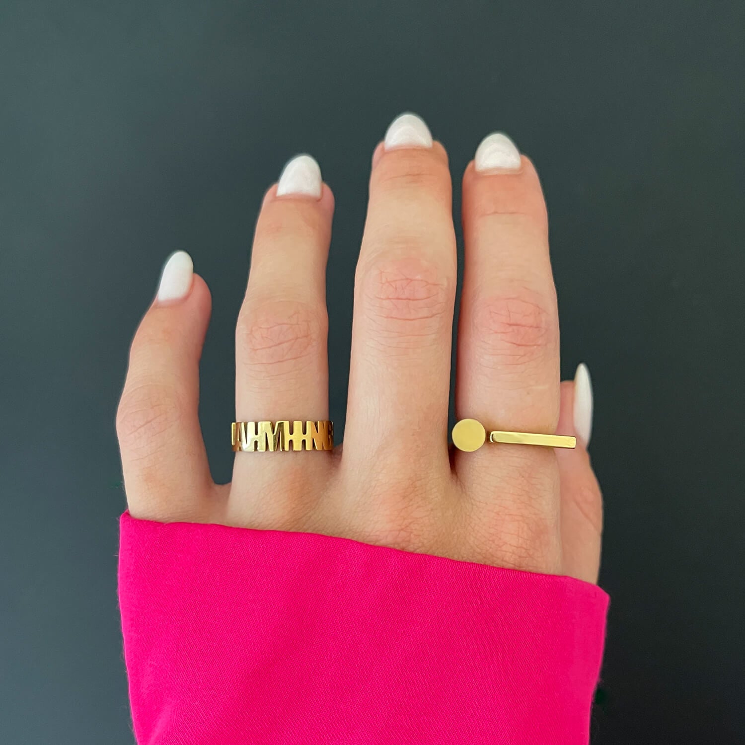 Išskirtinis žiedas su žodžiu LAIMINGA iš auksuoto nerūdijančio plieno. Mažos detalės – dideli jausmai.