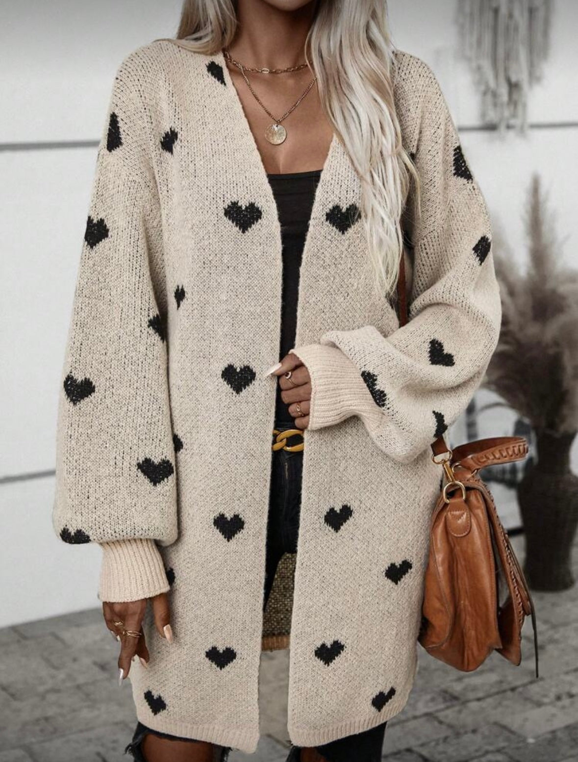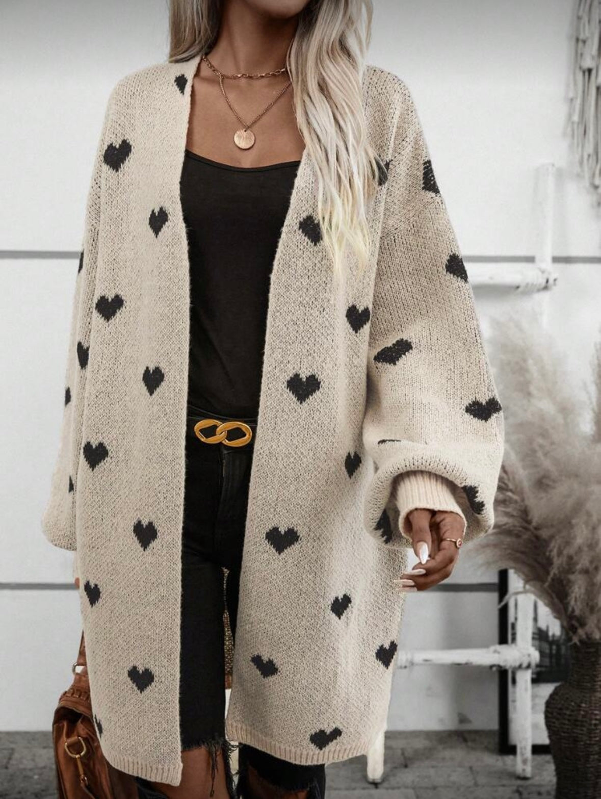 Elegantiškas ir jaukus ilgas kardiganas su subtiliu širdelių raštu – tobulas pasirinkimas stilingam ir patogiam įvaizdžiui. Laisvo silueto modelis gražiai krenta, suteikia lengvumo pojūtį ir nevaržo judesių, todėl puikiai tinka kasdieniam dėvėjimui.