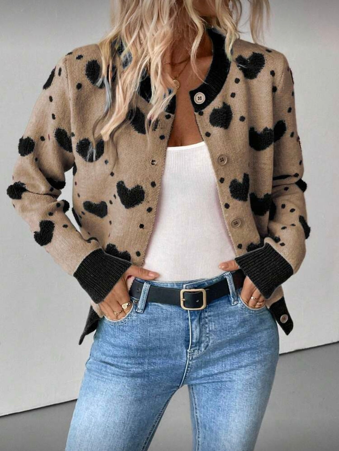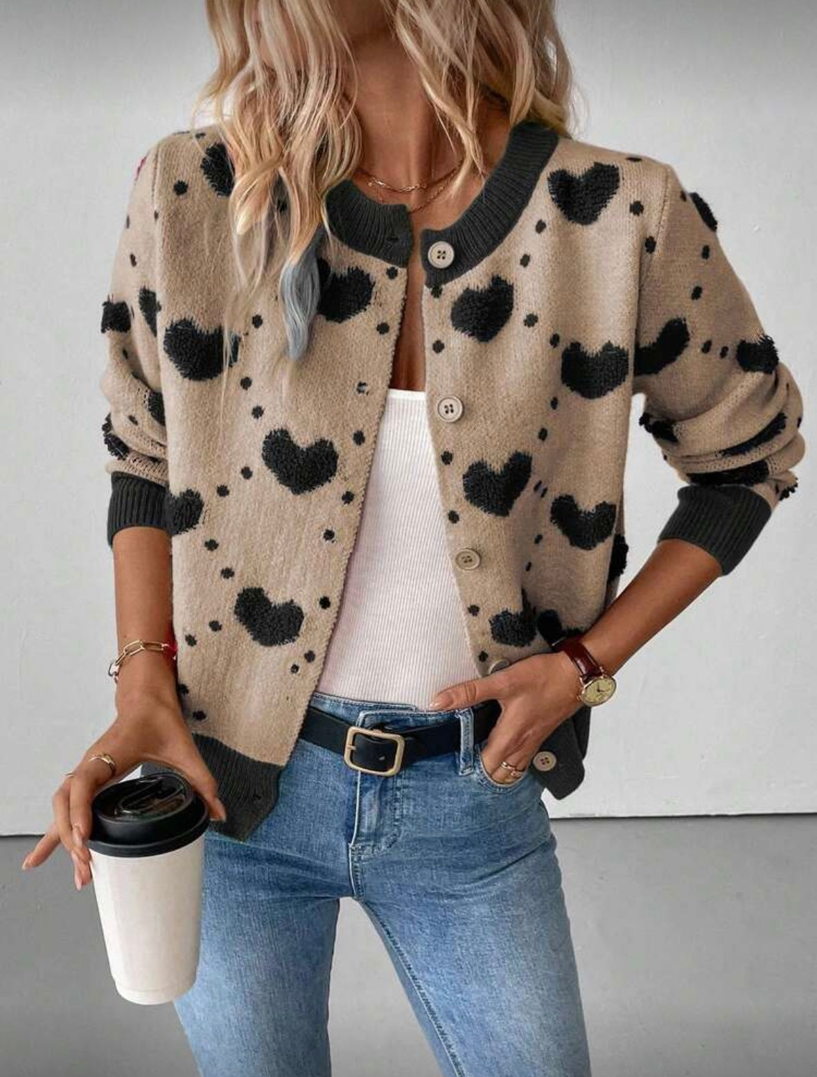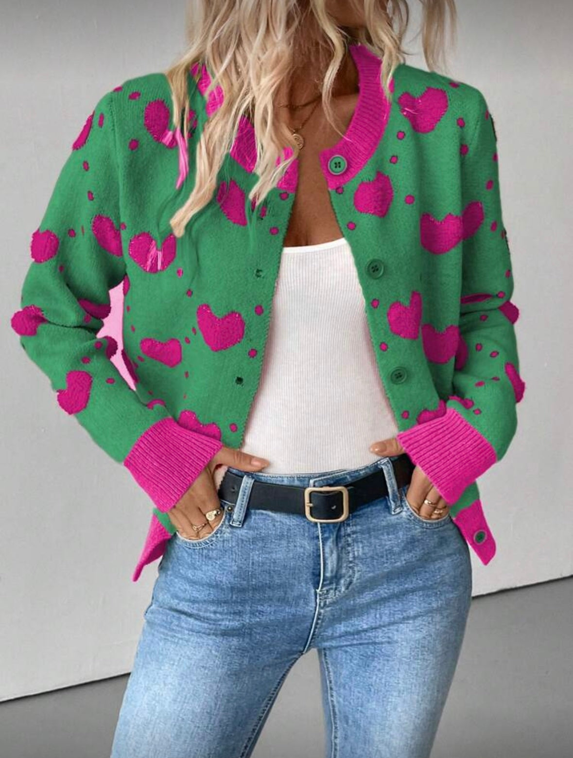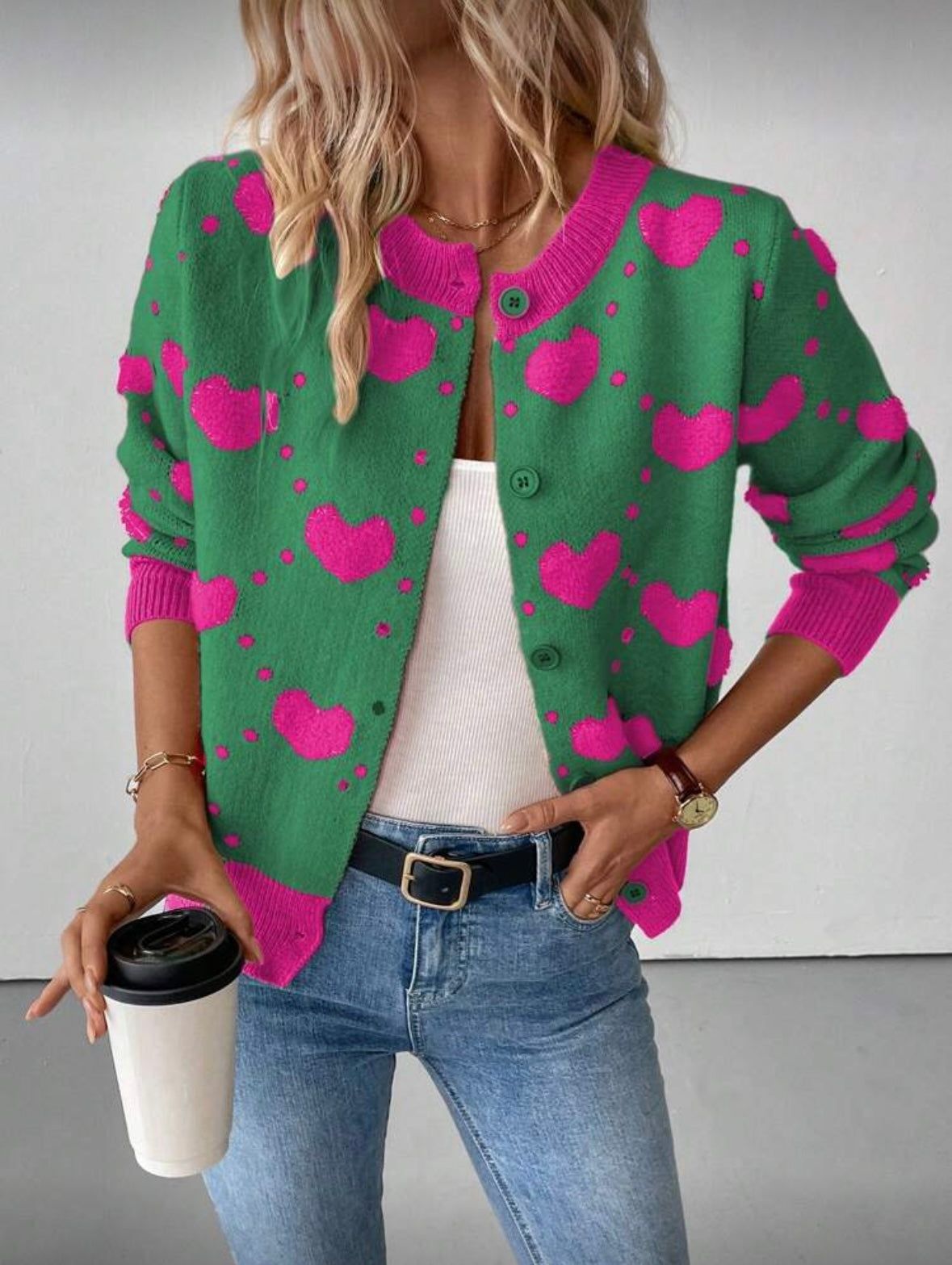Išskirtinis ir žaismingas megztinis su širdelių raštu – puikus pasirinkimas moterims, kurios nori savo įvaizdžiui suteikti spalvų ir jaukumo. Modernus dizainas derinamas su klasikine sagų užsegimo forma, todėl šis megztukas lengvai pritaikomas tiek kasdieniam, tiek laisvalaikio stiliui.