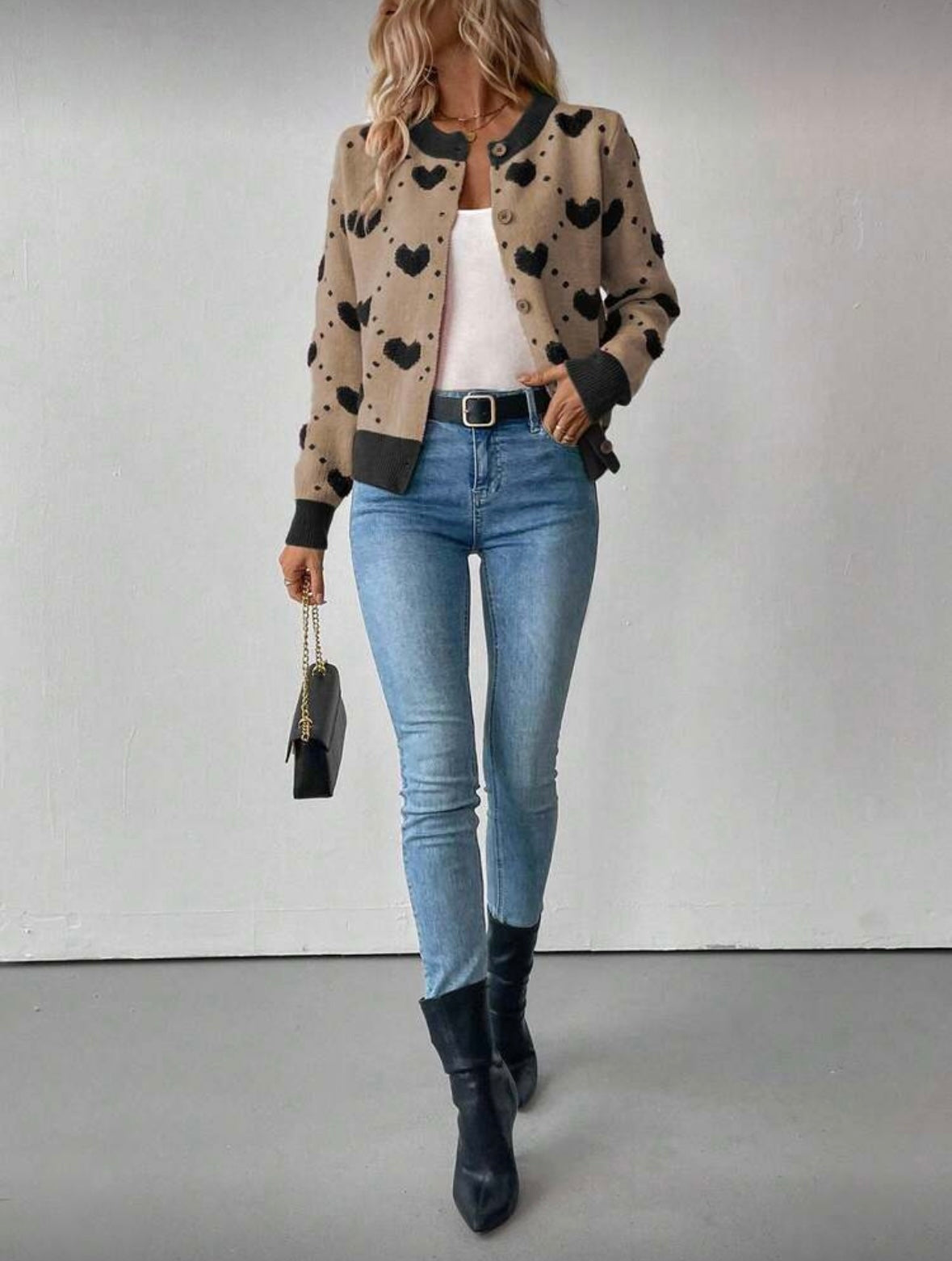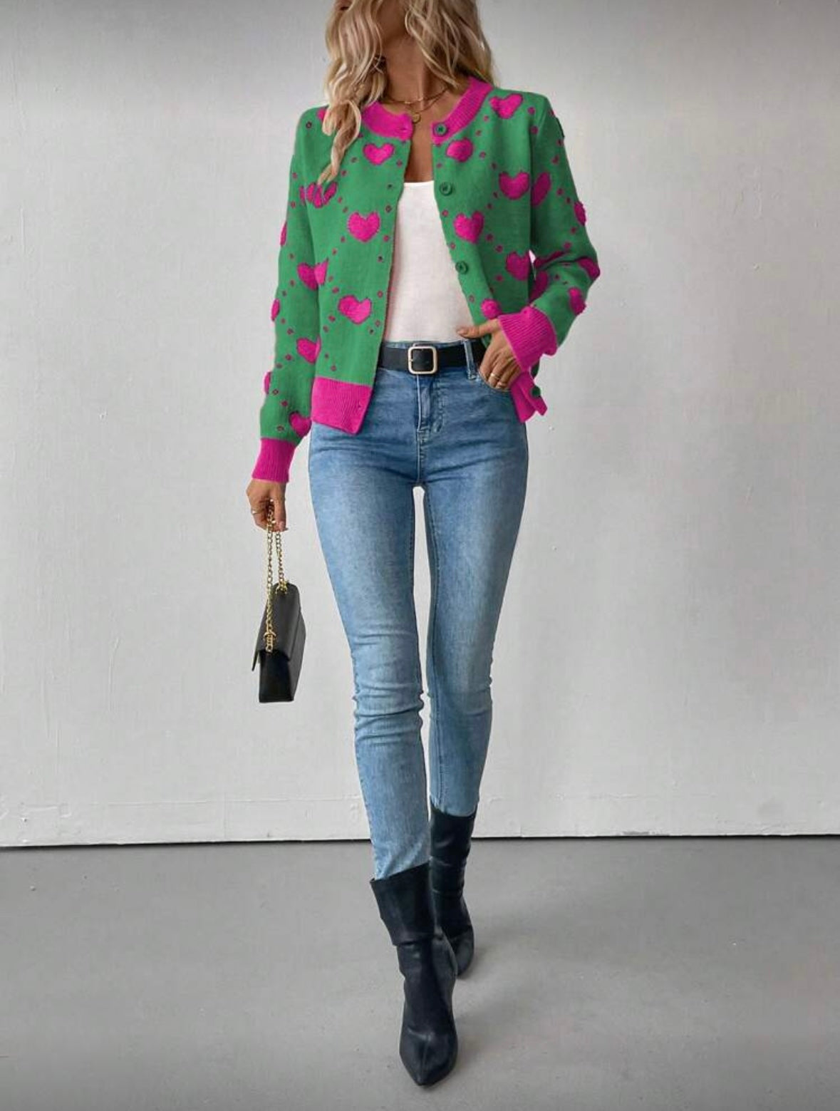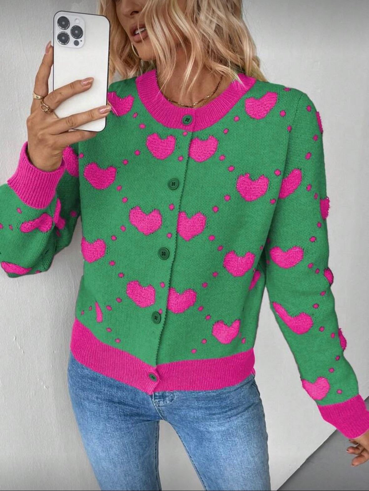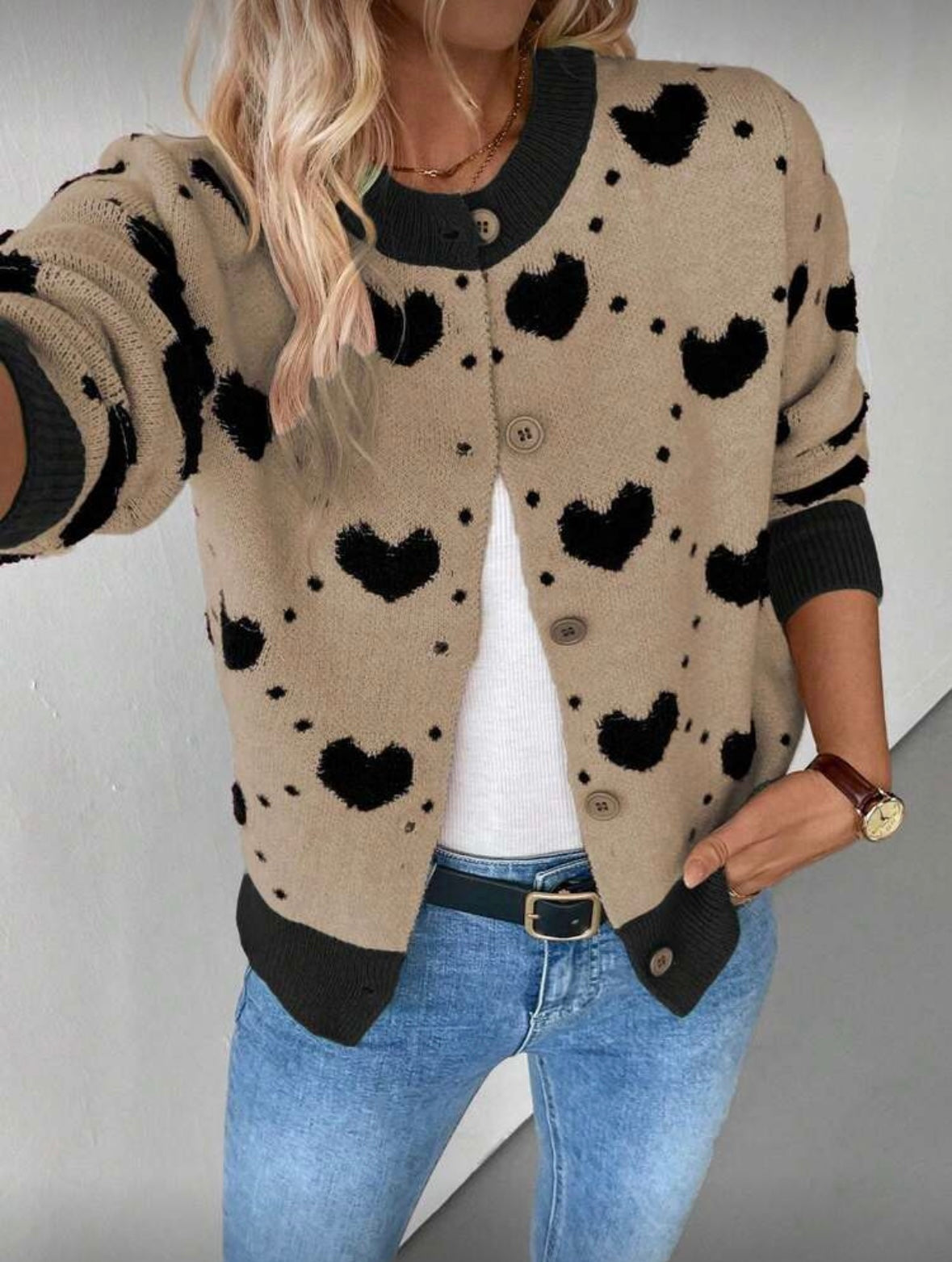 Išskirtinis ir žaismingas megztinis su širdelių raštu – puikus pasirinkimas moterims, kurios nori savo įvaizdžiui suteikti spalvų ir jaukumo. Modernus dizainas derinamas su klasikine sagų užsegimo forma, todėl šis megztukas lengvai pritaikomas tiek kasdieniam, tiek laisvalaikio stiliui.