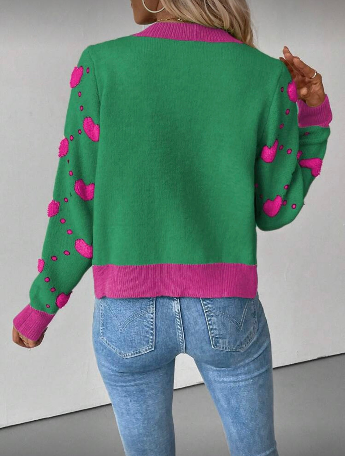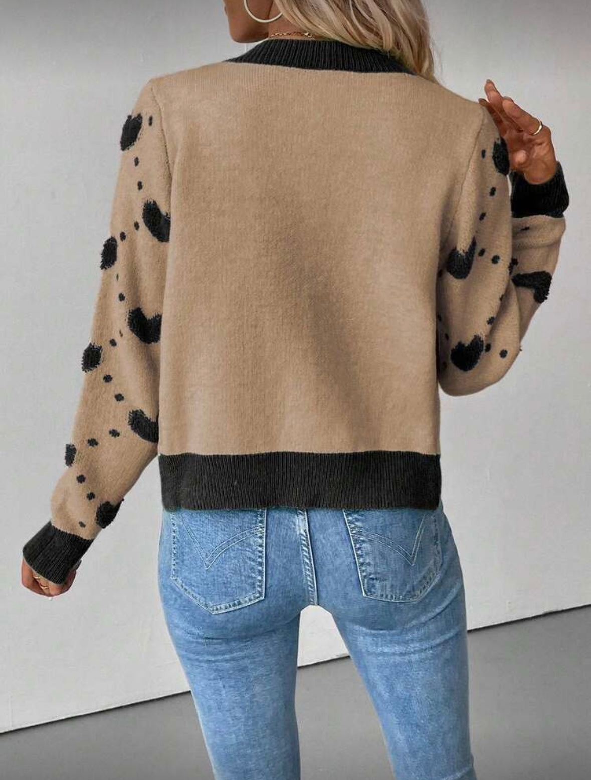 Moteriškas megztinis su širdelių raštu