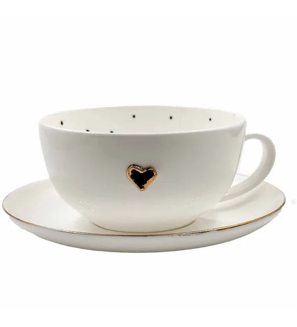 Balto porceliano puodelis išsiskiria subtiliu dizainu: viduje – juodi taškeliai, o išorėje – rankomis lipdyta juoda širdelė, dekoruota auksu. Šis derinys suteikia puodeliui tiek žaismingumo, tiek elegancijos. Puodelis puikiai tiks tiek mėgaujantis rytinė kava, tiek vakarine arbata. Lėkštutė papuošta auksiniu krašteliu, kuri harmoningai dera su puodelio dekoru. Puikus pasirinkimas ieškantiems išskirtinio ir stilingo puodelio. Talpa 280 ml.